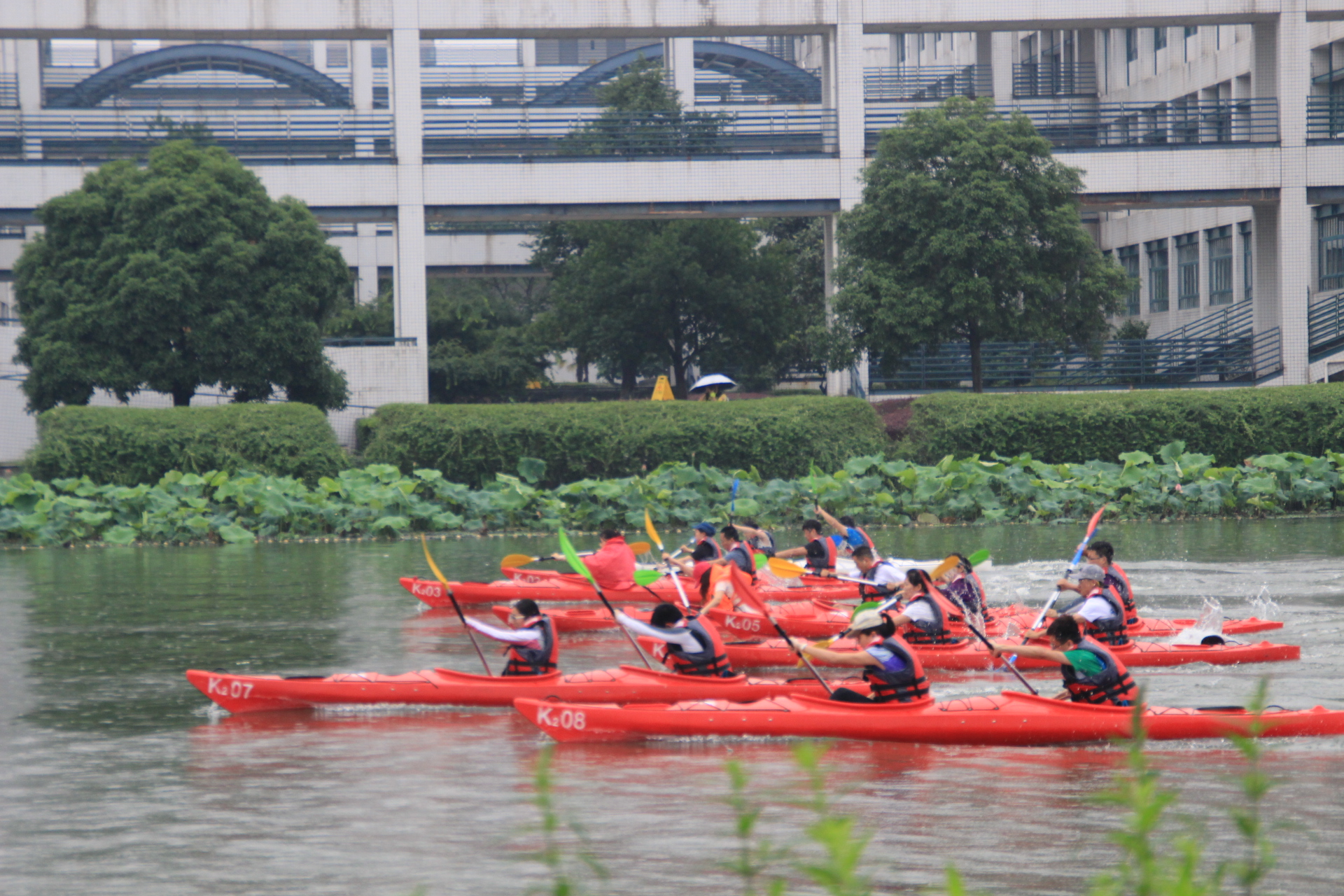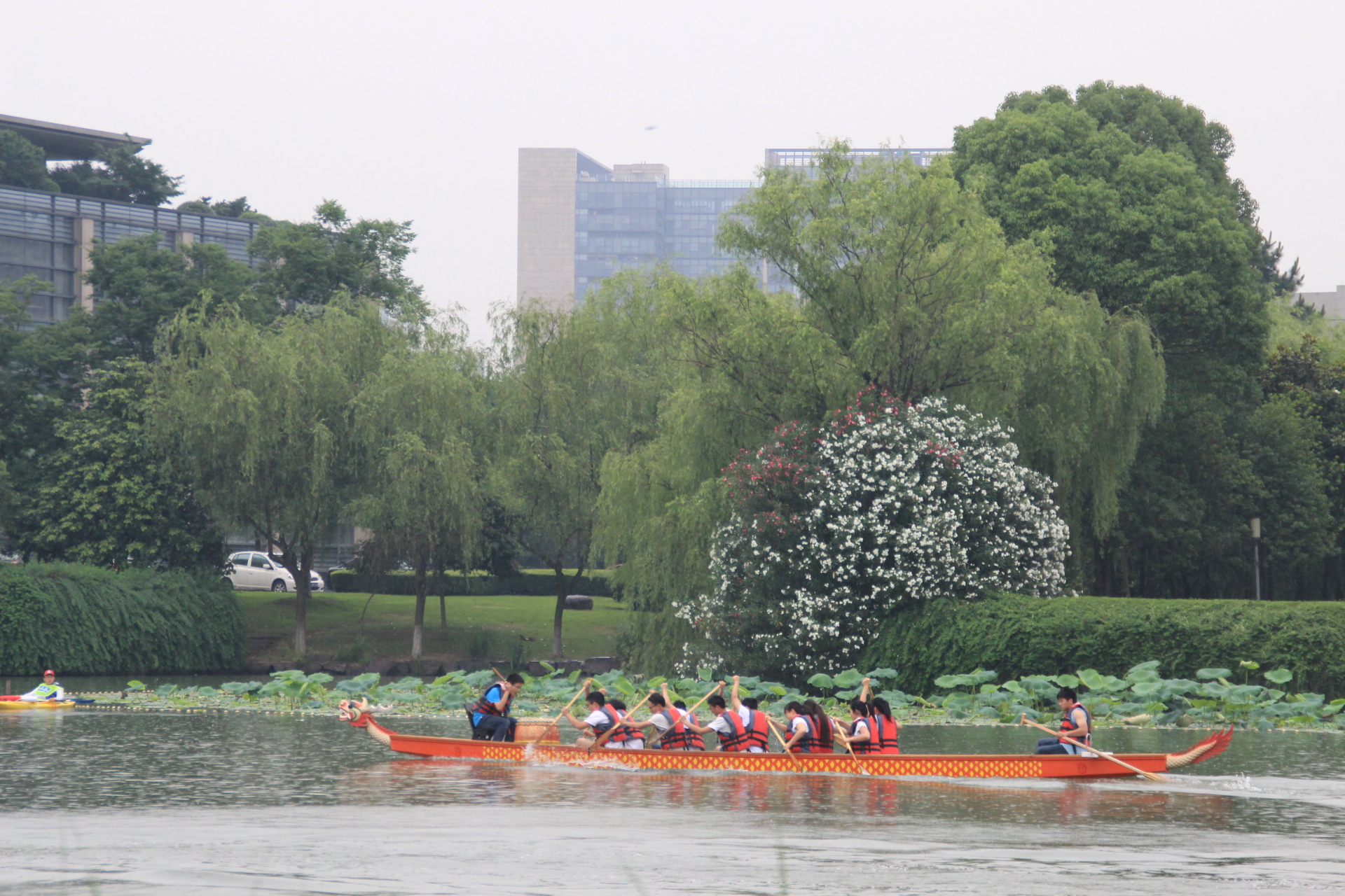 比赛首日,烈阳当空,但是挡不住同学们的竞赛渴望;而次日又是大雨倾盆,然而也浇不灭同学们的比赛热情。一个接着一个项目在启真湖畔举行,男子担任海洋舟200米直道竞速、女子双人海洋舟200米直道竞速、龙舟竞速等项目无一不引起前来观赛的同学老师拍手鼓劲,加油呐喊。我们的医学院的运动健儿们与其他各个院系的同学们在启真湖上比拼技巧、比拼耐力、比拼速度,赛出了自己水平与风格。