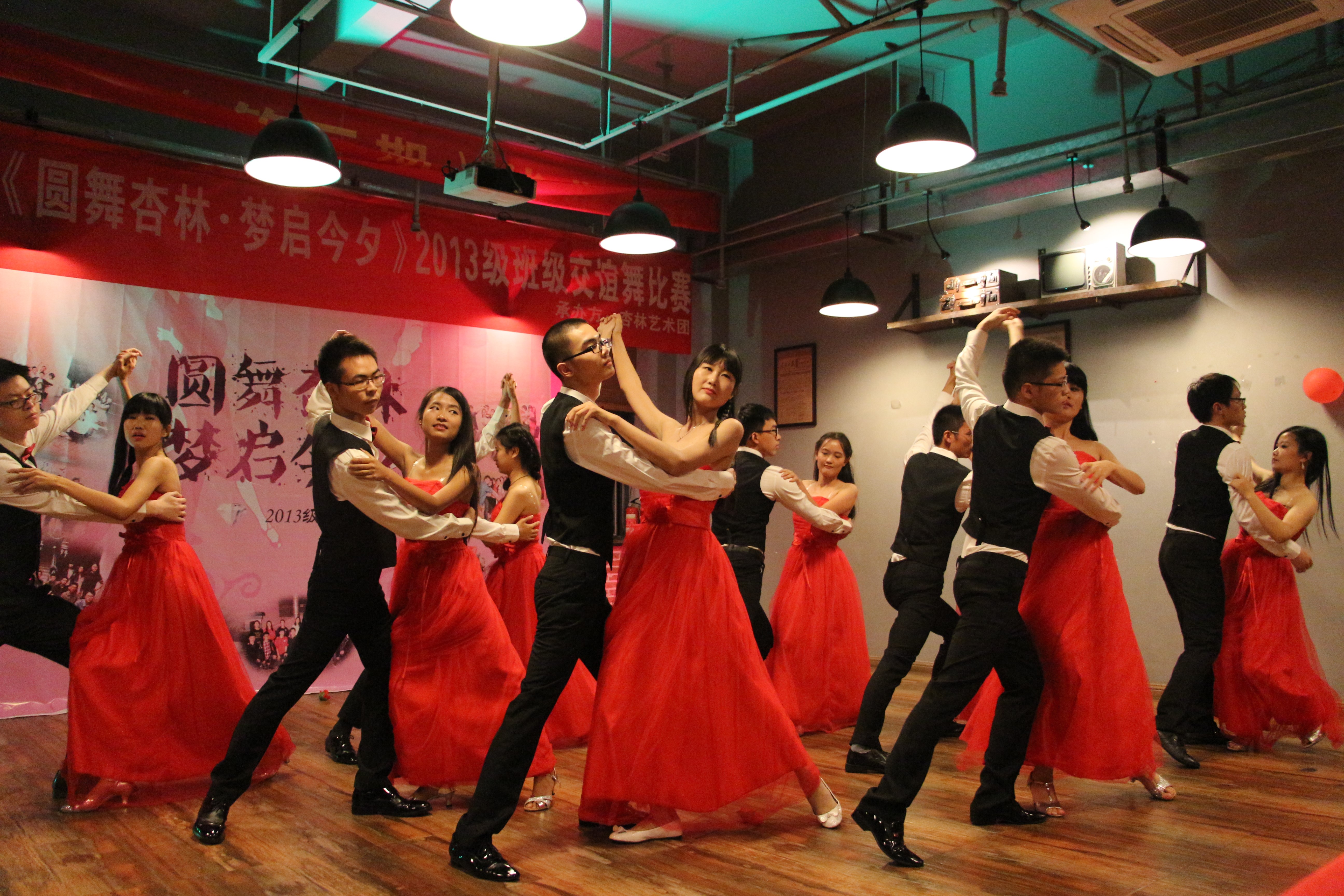 绚丽的灯光犹如天女撒下的朵朵花瓣,优雅地流洒飘零,落在13级学生们神采奕奕、容光焕发的脸庞上。舞会中他们盛装出席、笑容满面,迈着自信的步子,紧携舞伴之手,眼波流转之间舞步变幻:时而轻云般慢移,时而旋风般旋转,舞蹈出诗句里的悲欢离合。华灯初上,似梦似幻,轻缓的音乐中上演着王子与公主的邂逅,让观众们深深沉醉。