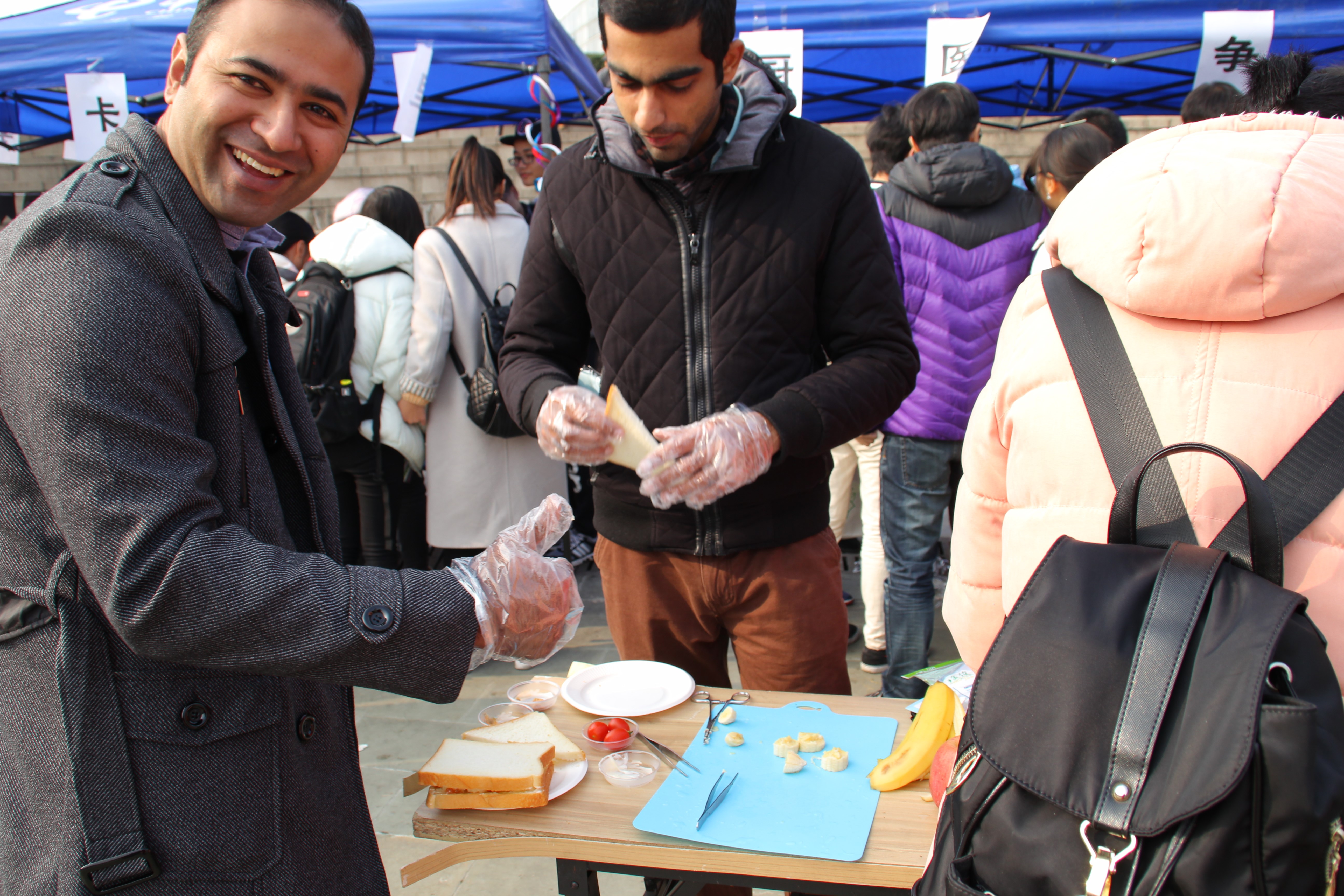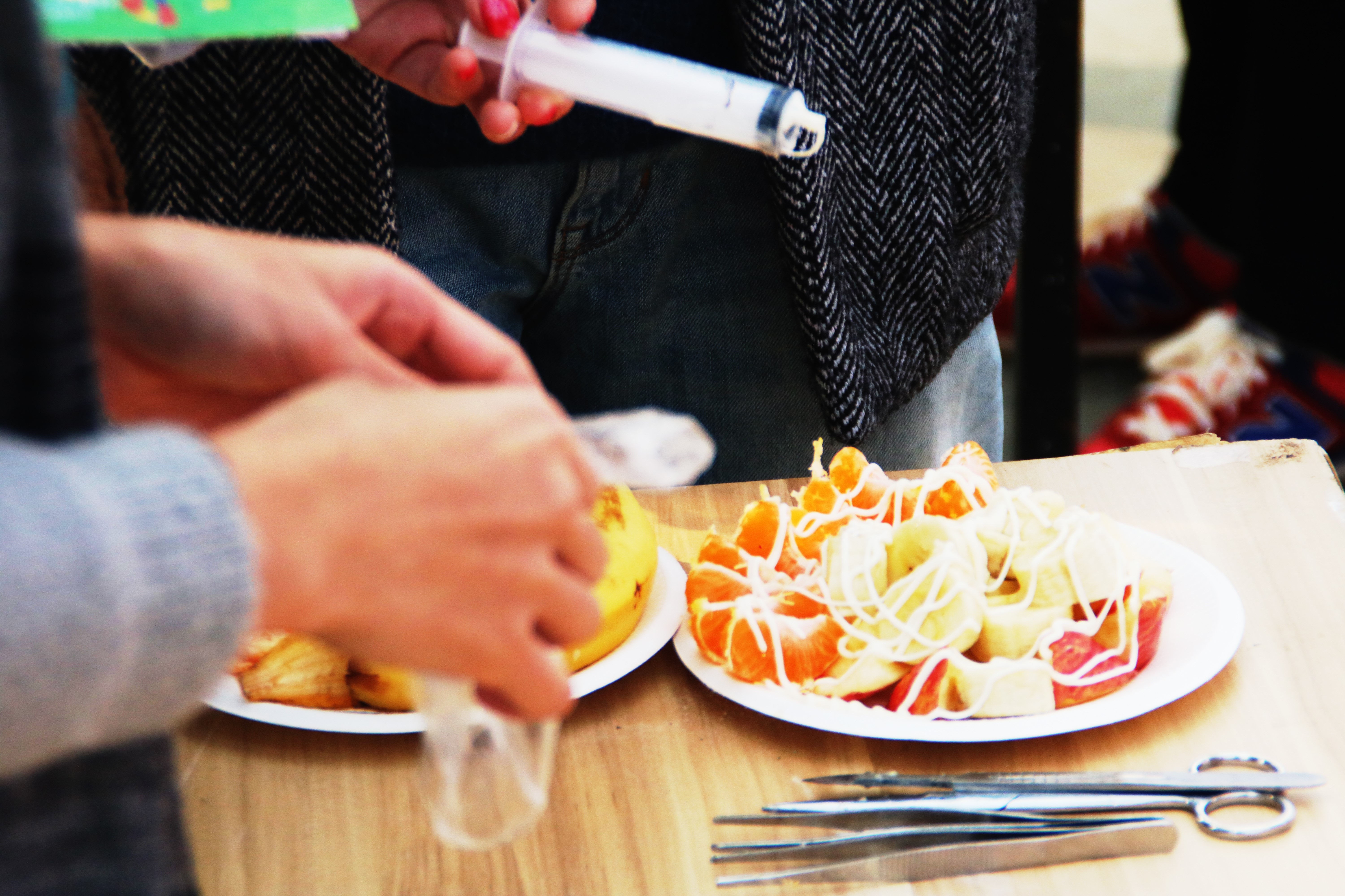 “厨医争霸”活动里同学们三五结队,用手术器具一起做一份三明治或者水果沙拉,赢得游戏还能享受一番自己亲手制作的美食,反响热烈。拿起手术刀切水果是怎样的一种感受呢?那就让我们来问问参加医学常用器械学习SQTP的同学们吧,同学们在向他们认真学习了各个手术器械的用法后,利用所提供的食材发挥自己的创造制作了既美观又美味的三明治或水果沙拉,体验了一把拿手术刀的感觉,吃得也十分满足。