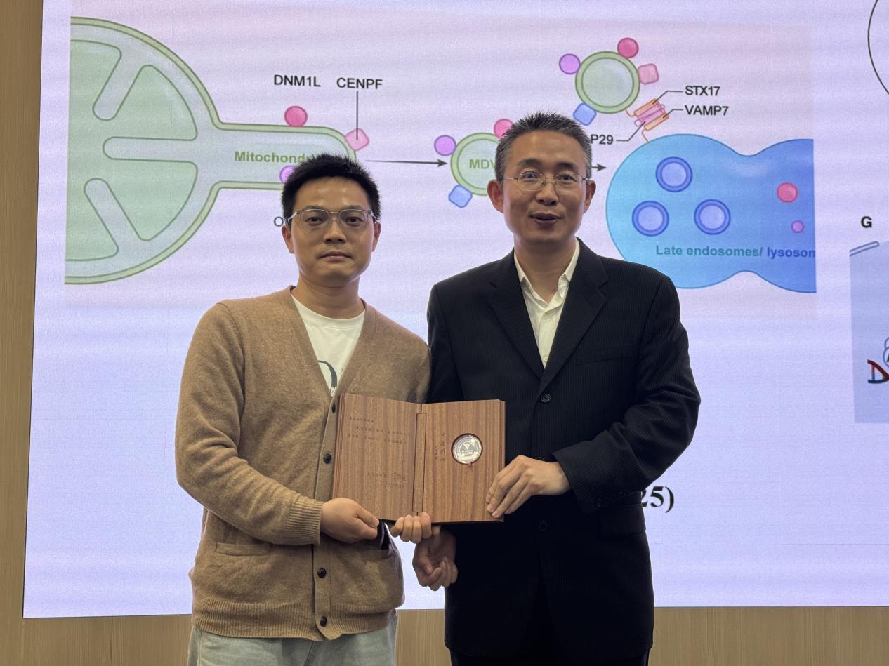 贾教授团队综合利用细胞生物学、生物化学、蛋白质组学、斑马鱼与小鼠模型等多种手段,研究细胞器的动态调控、囊泡运输及相关神经系统疾病的致病机制,并开发治疗手段。在本次报告开始之际,贾教授向大家提出了囊泡运输领域的“哲学三问”:囊泡是什么?囊泡从哪里来?囊泡要到哪里去?围绕这三个基本的科学问题,贾教授向在场的师生们分享了他的团队近年来的研究工作进展:他们发现了囊泡运输过程中首个可以识别特定货物蛋白基序的囊泡栓系复合物并阐明了潜在的分子调控机理,他们首次揭示了代谢物β-羟基丁酸可以通过诱导线粒体囊泡的形成调控线粒体的质量控制并在酒精诱导的肝损伤中发挥一定的保护作用。